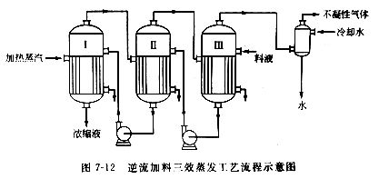 ②逆流加料法 逆流加料法工藝流程見圖7-12所示。此法蒸汽流向與料液流向相反,加熱蒸汽的流向與順流加料法相同,而料液則末效加入,依次用泵將料液送到前一效,濃縮由第一效放出。