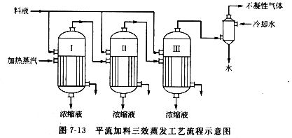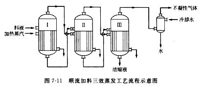 (1)在多效蒸發(fā)過程中,蒸汽與被濃縮料液流向有多種形式。根據(jù)蒸汽與被濃縮料液流向不同,可將多效濃縮工藝流程分為順流、逆流、平流三種形式?,F(xiàn)以三效濃縮為例介紹如下。