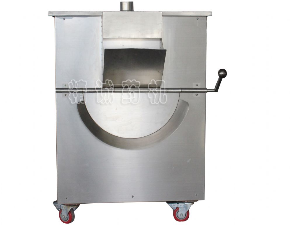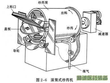 滾筒式炒藥機(jī) 由炒藥滾筒、動(dòng)力系統(tǒng)及熱源等部件組成,有的還附有加料裝置的出料裝置,見圖2-6所示。操作時(shí),將藥材通過筒口加入,蓋如筒蓋板(為了散熱常在蓋板上留有散熱孔)。加熱后,開動(dòng)滾筒,借動(dòng)力裝置滾筒做順時(shí)針方向轉(zhuǎn)動(dòng)。使筒壁均勻受熱。當(dāng)藥材炒到規(guī)定程度時(shí),打開蓋板,按動(dòng)是鈕,使?jié)L筒反向旋轉(zhuǎn),即可使藥材由出料口傾出。滾筒式炒藥機(jī)的熱源可用爐火,也可用電爐可煤氣。